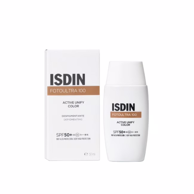 ISDIN FotoUltra 100 Active Unify Fusion Fluid SPF50+ це щоденний сонцезахисний крем, призначений для шкіри з темними плямами. Він не тільки забезпечує дуже високий захист від UVA та UVB променів, але й допомагає запобігти появі темних плям та зменшити їх, вирівнюючи тон шкіри. Завдяки комплексу DP3-Unify, який діє на основні фази меланогенезу, він допомагає регулювати вироблення меланіну. А завдяки потужній комбінації антиоксидантів і сонцезахисних фільтрів, він також забезпечує дуже високий захист від UVA і UVB променів. Він підходить для всіх типів шкіри, включаючи чутливу, і має легку текстуру, яка легко наноситься і швидко вбирається. Загалом, він не лише забезпечує потрійну депігментуючу дію, яка вирівнює тон шкіри, але й захищає її від сонця.